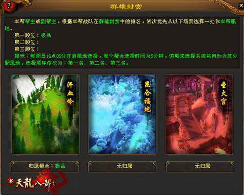 【属地争夺】      外敌大举侵略,内忧外患之下,君王决议以三块属地为赏,奖给最勇敢的帮会,以招集群雄,共同反抗外敌。属地分别为:昆仑福地、圣火宫和汗血岭。为了夺得这样的属地发展自己帮会的实力,各路英雄豪杰都在跃跃欲试!这不仅是一个优势,更是一种荣耀,一种实力的标志。然而夺得属地的进程却非常艰难的。      在每周日15:00-16:00,帮会的帮主或副帮主可作为队长,组织一个所有成员等级均≥90级的6人部队报名参与群雄封赏活动。报名后,依据各报名小队配备总评分排序,配备总评分前8名的帮会部队可以参与属地争夺。具有参赛资历的8个部队通过6V6的PK,将决出前三名。前三可依据排名顺序,在必定时刻内选择指定场景作为帮会属地,若未在必定时刻内做出选择,则会随机分配一个尚未被选择的属地。