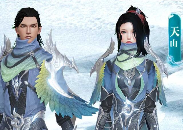 男款時裝盡顯幹練與挺立,腿部戰甲規劃極具包裹感,仿佛遁身於夜色,隨時都會爆發出逾越常人的速度與力量。雙肩靈鷲徽記分外引人矚目。 好像與刺客習氣的低調不符,而這恰恰展現出對天山武學的理解與自傲。衣領處紗巾蒙面,銀飾在月色下映射出駭人的光芒,危險已經悄然臨近。